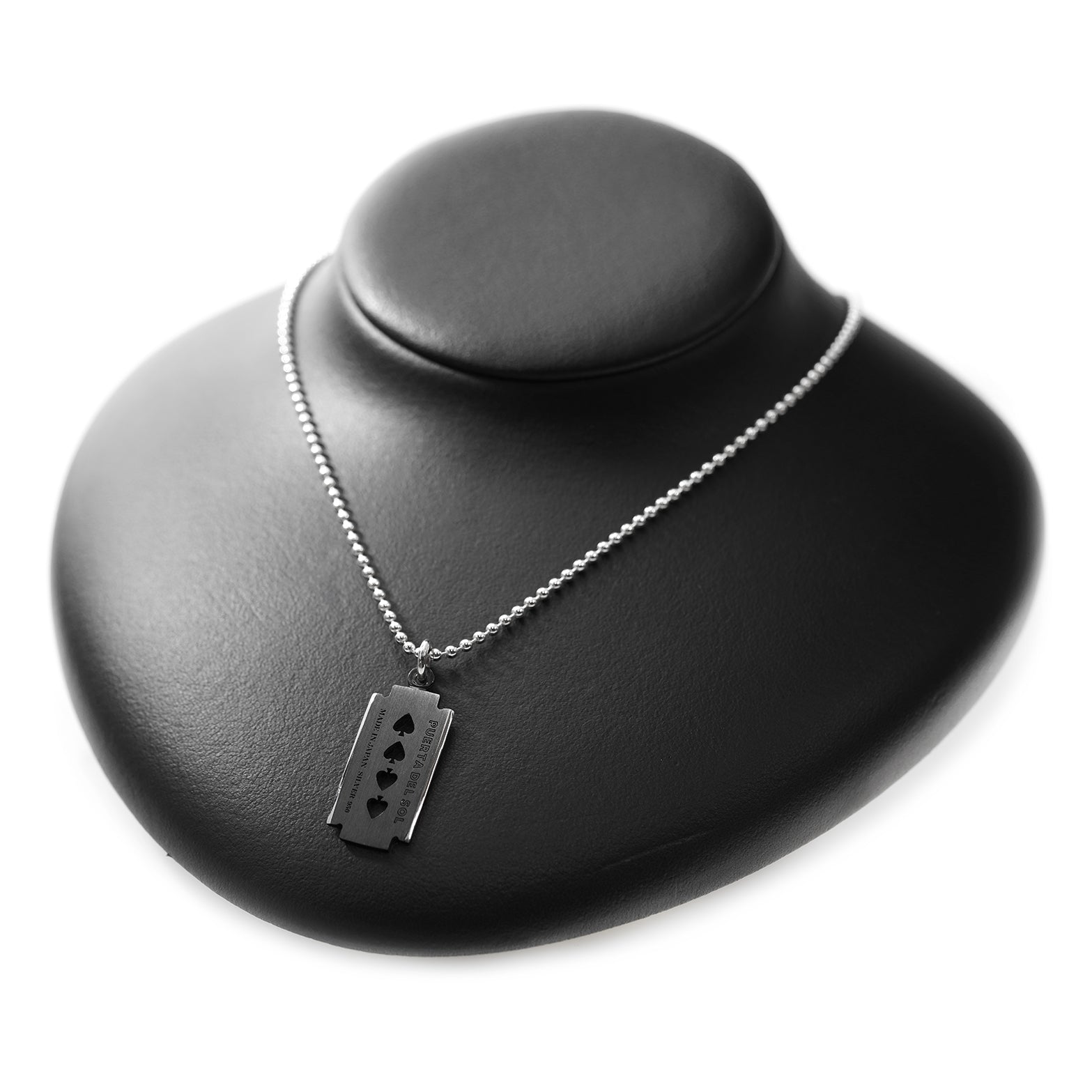 【Razor Necklace】反逆のシンボルとして用いられてきた「カミソリ」をモチーフに、エッジの効いたデザインで再構築。シャープでリアリティのあるフォルムに、スペードがさりげない遊び心を添えています。