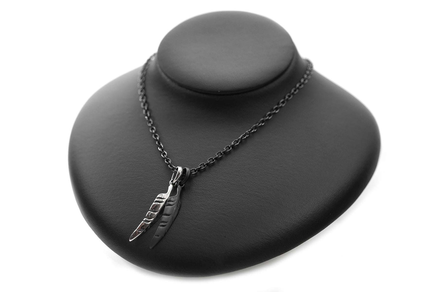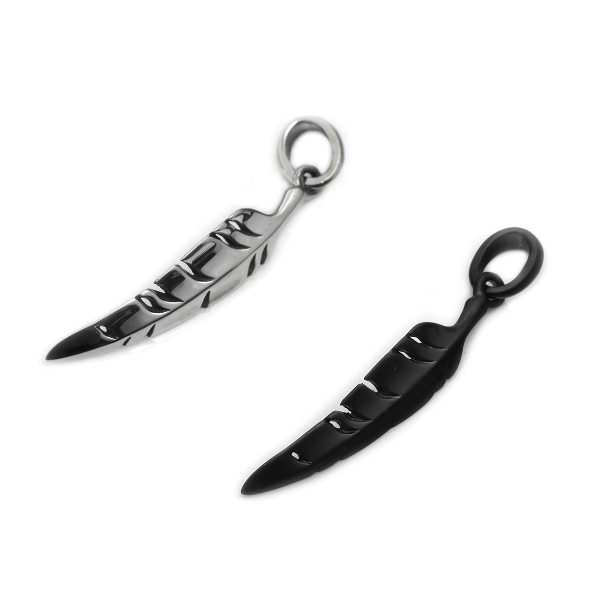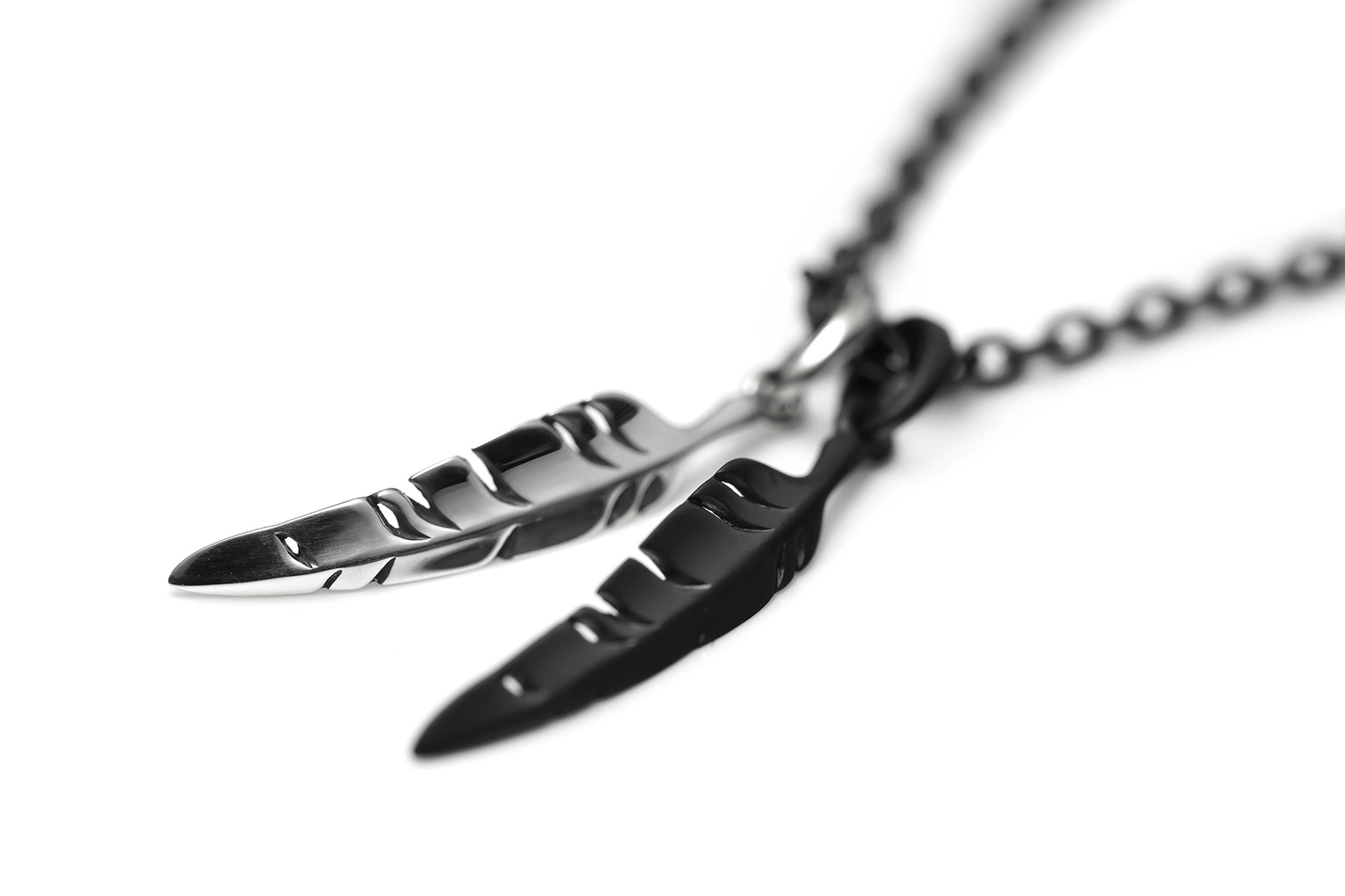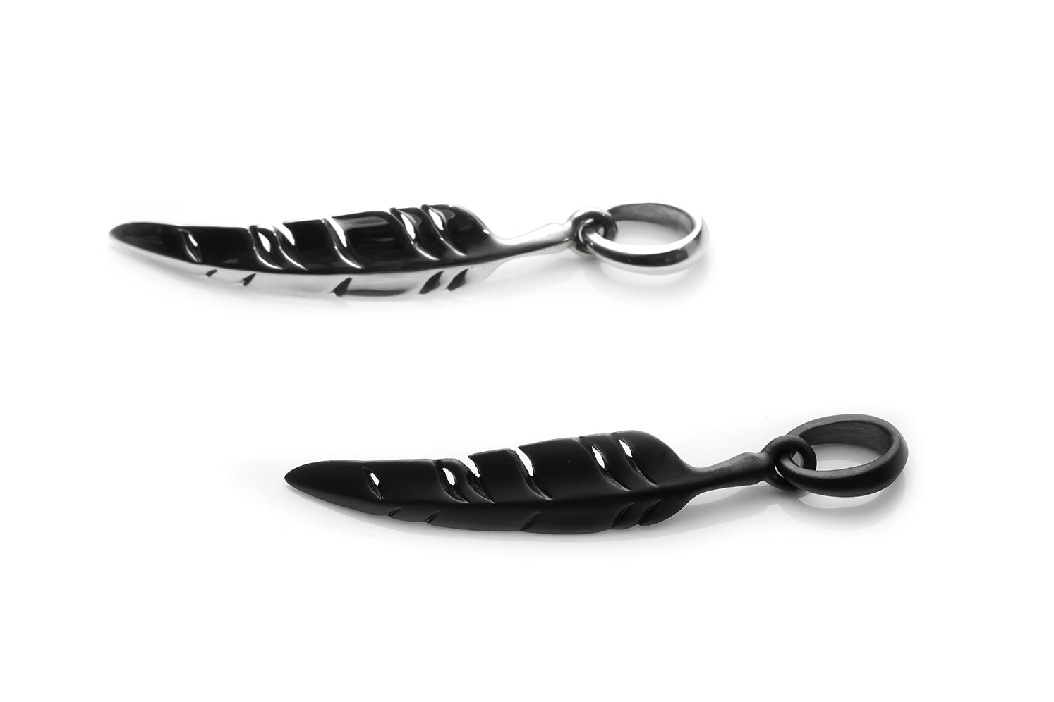 【Feather Pendant】飛翔の象徴である「風切羽」をモチーフにデザインされたペンダントトップ。他の羽よりもシャープなフォルムが、洗練されたスタイリッシュな印象を演出します。ラージタイプ(PE914)との重ね付けで、より立体的で奥行きのあるスタイルに。