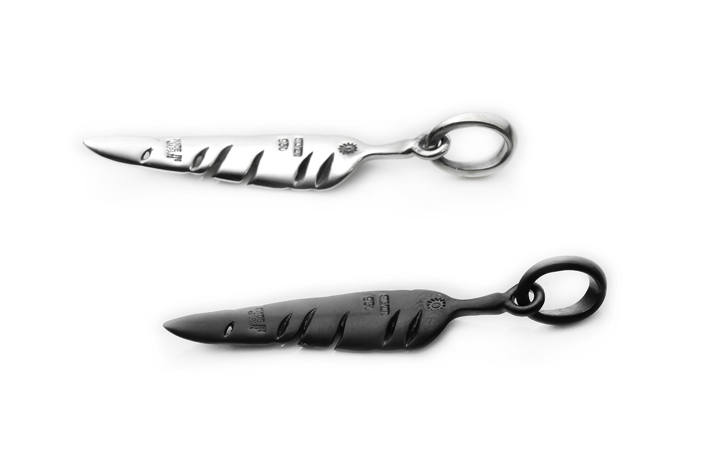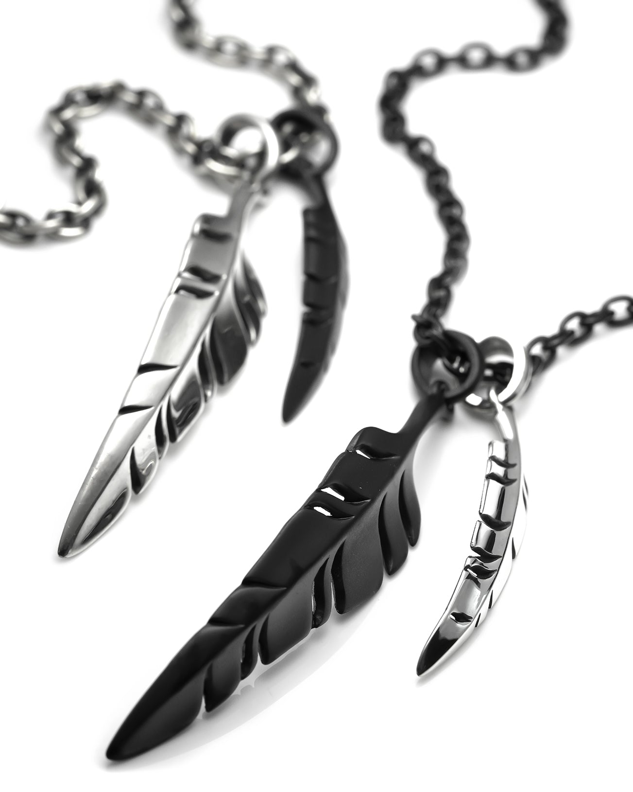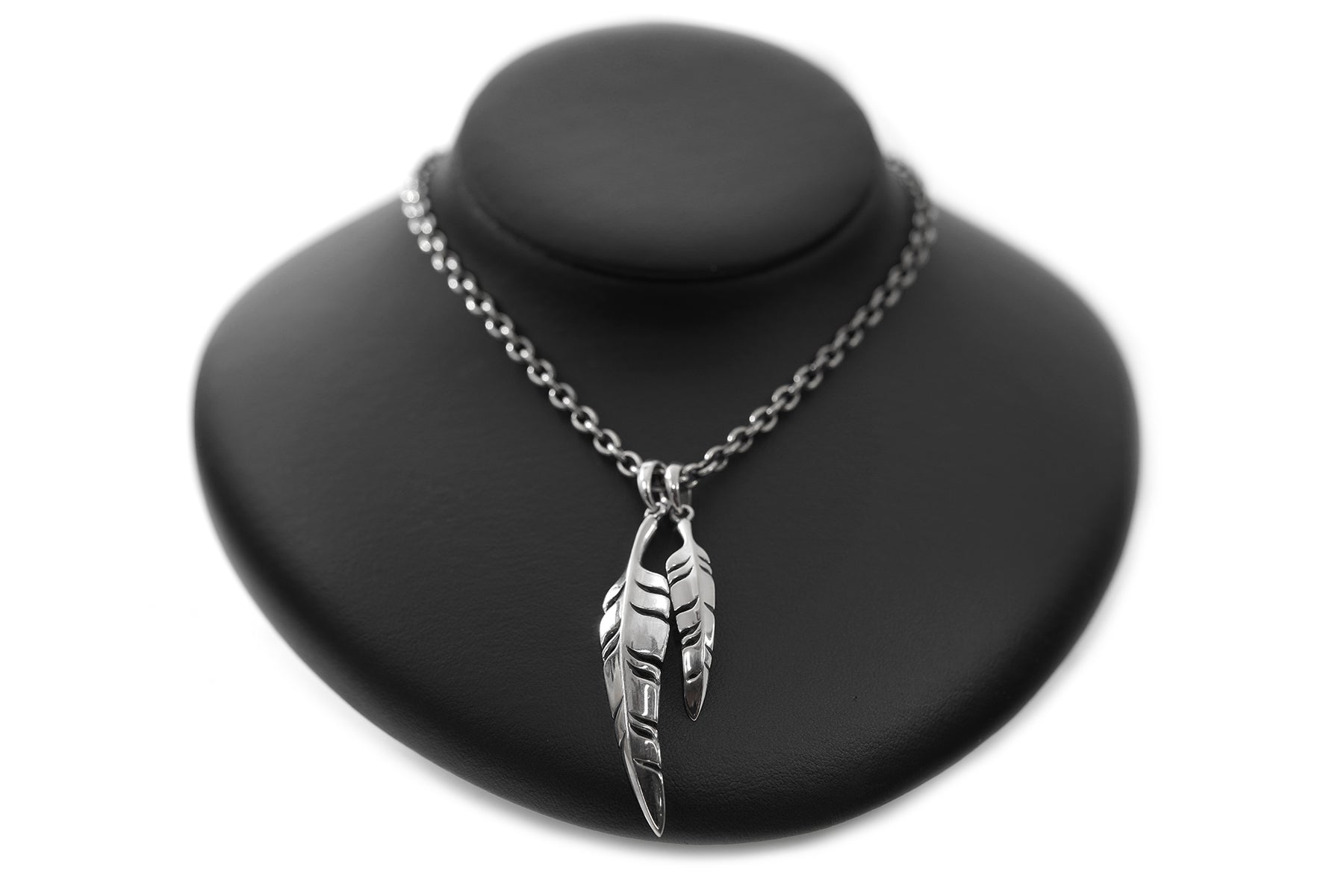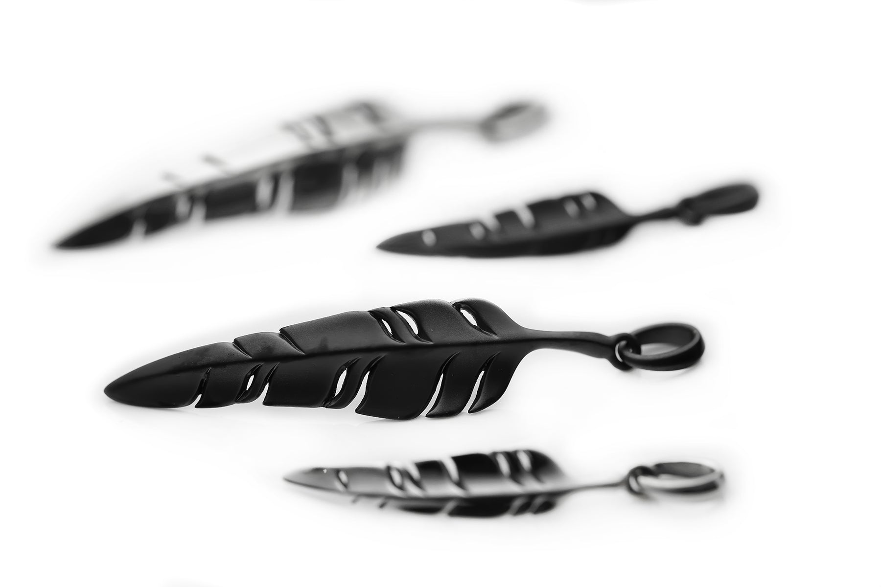 【Feather Pendant】飛翔の象徴である「風切羽」をモチーフにデザインされたペンダントトップ。他の羽よりもシャープなフォルムが、洗練されたスタイリッシュな印象を演出します。ラージタイプ(PE914)との重ね付けで、より立体的で奥行きのあるスタイルに。